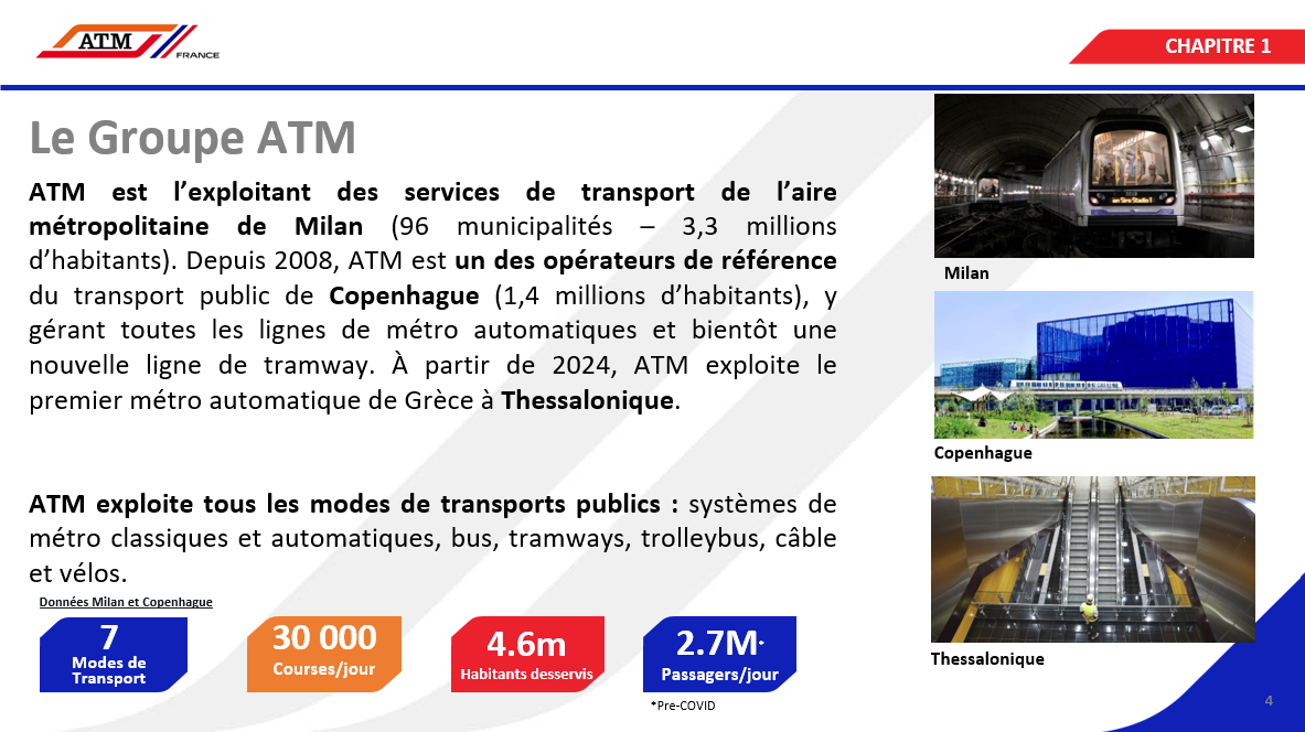 final-responsable-des-equipes-de-ligne-referent-6916003aa49b5233583253.pdfATM est l’exploitant des services de transport de l’aire métropolitaine de Milan (96 municipalités – 3,3 millions d’habitants). Depuis 2008, ATM est un des opérateurs de référence du transport public de Copenhague (1,4 millions d’habitants), y gérant toutes les lignes de métro automatiques et bientôt une nouvelle ligne de tramway. À partir de 2024, ATM exploite le premier métro automatique de Grèce à Thessalonique. ATM exploite tous les modes de transports publics : systèmes de métro classiques et automatiques, bus, tramways, trolleybus, câble et vélos